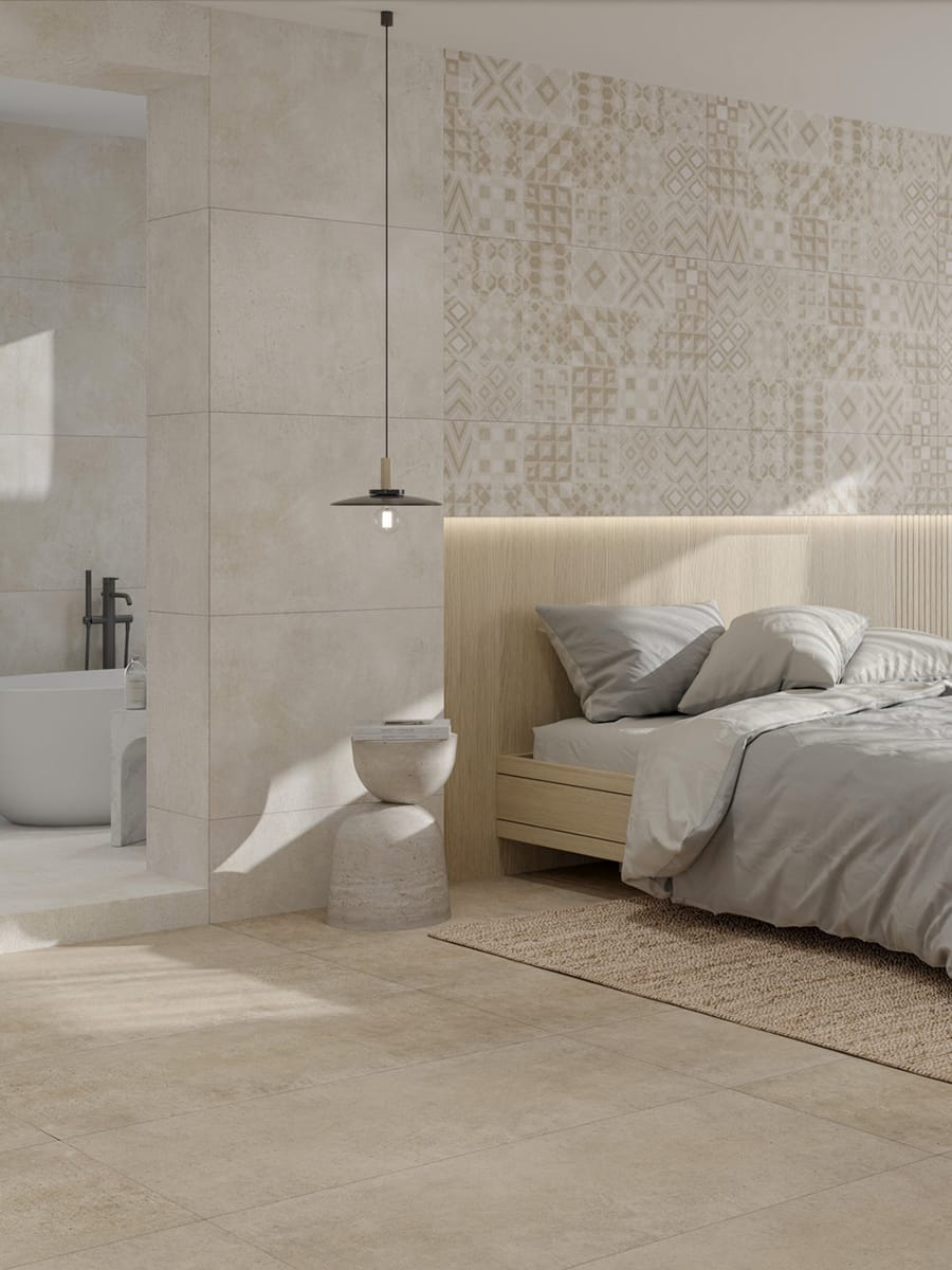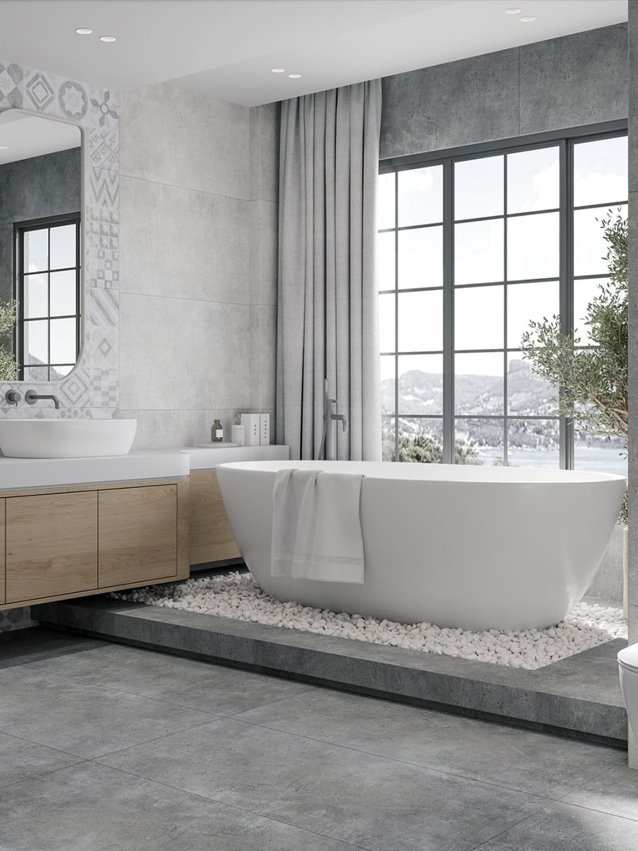 Calm and pleasant cream and gray shades, in line with majolica decor, emphasize dynamics and create an impressionistic atmosphere that will leave no one indifferent. Its design includes a compact base, lightly sprinkled with dark flecks, delicately representing industrial concrete. The wide range of formats, along with the monochromatic assortment, makes this collection an ideal solution for industrial-style designs and minimalist aesthetics.